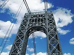 The masonry facades were ultimately never built; the exposed steel towers, with their distinctive criss-crossed bracing, became one of the George Washington Bridge's most identifiable characteristics.[36][2] While the exposed steel towers' design was negatively received by a few critics such as Raymond Hood and William A. Boring, the public reception at the bridge's opening was generally positive.[18] The Swiss-French architect Le Corbusier wrote of the towers: "The structure is so pure, so resolute, so regular that here, finally, steel architecture seems to laugh."[55][29] Milton MacKaye wrote in The New Yorker that the George Washington Bridge had established Ammann as "one of the immortals of bridge engineering and design, a genius."[56] After the George Washington Bridge was successfully constructed without masonry towers, Ammann did not incorporate any masonry towers in his bridge plans.[45] Ammann wrote that the "sturdy appearance and well-balanced distribution of steel in the columns and bracing" gave the bridge's towers "a good appearance, a neat appearance".[15][57]