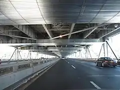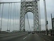 The bridge carries 14 lanes of traffic, seven in each direction.[16][17] As such, the George Washington Bridge contains more vehicular lanes than any other suspension bridge, and is the world's busiest vehicular bridge.[5][19][6][7] The fourteen lanes of the bridge are split unevenly across two levels: the upper level contains eight lanes while the lower level contains six lanes.[16][17] The upper level opened in 1931,[20] and is 90 feet (27 m) wide.[1] The upper level originally had six lanes, though two more lanes were added in 1946.[21] Although the lower level was part of the original plans for the bridge, it did not open until 1962.[17] The upper level has a vertical clearance of 14 feet (4.3 m), and all trucks and other oversize vehicles must use the upper level. Trucks are banned from the lower level, which has a clearance of 13.6 feet (4.1 m). All lanes on both levels are 8 feet 6 inches (2.59 m) wide.[3][22] Vehicles carrying hazardous materials (HAZMATs) are prohibited on the lower level due to its enclosed nature. HAZMAT-carrying vehicles may use the upper level, provided that they conform to strict guidelines as outlined in the Port Authority's "Red Book".[3][23]
