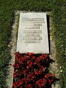 De Hevesy married Pia Riis in 1924. They had one son and three daughters together, one of whom (Eugenie) married a grandson of the Swedish Nobel laureate Svante Arrhenius.[15] De Hevesy died in 1966 at the age of eighty and was buried in Freiburg. In 2000, his corpse was transferred to the Kerepesi Cemetery in Budapest, Hungary. He had published a total of 397 scientific documents, one of which was the Becquerel-Curie Memorial Lecture, in which he had reminisced about the careers of pioneers of radiochemistry.[16] At his family's request, his ashes were interred at his birthplace in Budapest on 19 April 2001.