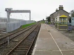 In 2012, the former platform 1 was removed as part of a scheme to construct a new freight terminal on the site.[7] As this platform was located on a passing loop which did not connect directly to the Thurso branch, it was very little-used by passenger trains, since all services through the station run to or from Thurso.[11] The purpose of the passing loop dates back to the era of loco-hauled trains which divided/attached at the station – an Inverness-bound train from Wick would loop around the Thurso portion standing on the second (remaining) platform, and attach to it from behind.
