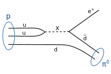 In the lowest-order Feynman diagram corresponding to the simplest source of proton decay in SU(5), a left-handed and a right-handed up quark annihilate, yielding an X+ boson, which decays to a right-handed (or left-handed) positron and a left-handed (or right-handed) anti-down quark: