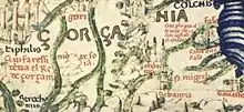 The first mention of the name spelled as “Georgia” is in Italian on the mappa mundi of Pietro Vesconte dated AD 1320,[13] At the early stage of its appearance in the Latin world, it was not always written in the same transliteration, and the first consonant was being spelt with J as "Jorgia".[14] "Georgia" probably stems from the Persian designation of the Georgians – gurğān, in the 11th and 12th centuries adapted via Syriac gurz-ān/gurz-iyān and Arabic ĵurĵan/ĵurzan. Lore-based theories were given by the traveller Jacques de Vitry, who explained the name's origin by the popularity of St. George amongst Georgians,[15] while traveller Jean Chardin thought that "Georgia" came from Greek γεωργός ("tiller of the land"). As Prof. Alexander Mikaberidze adds, these century-old explanations for the word Georgia/Georgians are rejected by the scholarly community, who point to the Persian word gurğ/gurğān ("wolf"[16]) as the root of the word.[17] Starting with the Persian word gurğ/gurğān, the word was later adopted in numerous other languages, including Slavic and West European languages.[17][18] This term itself might have been established through the ancient Iranian appellation of the near-Caspian region, which was referred to as Gorgan ("land of the wolves").[17][19]