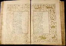 Collection of the Georgian manuscripts is divided into four sub-collections – A,[18] H,[19] Q[20] and S.[21] This collection contains both church and secular literary works. The preserved writings - "Martyrdom of Saint Shushanik", "Martyrdom of Evstati Mtskheteli", "Martyrdom of Abo Tbileli" form the cornerstone of the medieval Georgian church literature. Except of this collection comprises the notable works of Byzantine church literature translated into Georgian by Eqvtime Mtatsmindeli, Giorgi Mtatsmindeli, Eprem Mtsire, Arsen Ikaltoeli and other remarkable Georgian figures. From the secular literature are noteworthy handwritten copies of "Vepkhistkaosani" ("Man in the Panter Skin"), also other manuscripts containing astrological, geographic, medical, mathematic or military writings.[22]