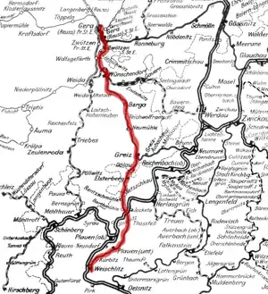 The Gera Süd–Weischlitz railway (also known as the Elstertalbahn—"Elster Valley Railway") is a main railway line in the German federal states of Thuringia and Saxony, which was originally built and operated by the Saxon-Thuringian Railway Company (Sächsisch-Thüringische Eisenbahngesellschaft). It runs in the valley of the White Elster (Weiße Elster) from Gera via Greiz and Plauen to Weischlitz.