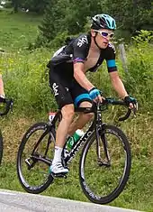 In June, Thomas led Team Sky at the 2018 Critérium du Dauphiné in the absence of Chris Froome, who had won the Giro d'Italia a week earlier.[107] Thomas crashed during the opening prologue and finished over 20 seconds down on Kwiatkowski, who won the stage.[108] Team Sky won the team time trial on Stage 3 with Thomas rising to fourth overall.[109] Thomas took the race lead after finishing second on Stage 5 to Valmorel[110] and increased his lead over Adam Yates to 1 minute 29 seconds on the following stage.[111] Despite having to chase back twice after suffering two punctures on the final stage, Thomas held on to take overall victory ahead of Yates and Romain Bardet (AG2R La Mondiale).[112]