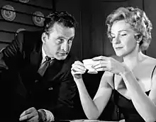 Between 1966 and 1969, Page appeared in two holiday-themed television productions based on stories by Truman Capote: "The Christmas Memory" (for ABC Stage 67) and the television film The Thanksgiving Visitor, both of which earned her two consecutive Emmy Awards for Best Actress.[22][23][24] In 1967, Page appeared again onstage in Peter Shaffer's Black Comedy/White Lies, a production which also included Michael Crawford and Lynn Redgrave, who were making their Broadway debuts.[25] The same year, she appeared opposite Fred MacMurray in the Walt Disney-produced musical The Happiest Millionaire.[1] Bosley Crowther of The New York Times was critical of the film, noting: "Geraldine Page and Gladys Cooper...square off in one musical scene of socially up-staging each other that is drenched in perfumed vulgarity. But, then, the whole picture is vulgar. It is an over-decorated, over-fluffed, over-sentimentalized endeavor to pretend the lace-curtain millionaires are—or were—every bit as folksy as the old prize-fighters and the Irish brawlers in the saloon."[26]
