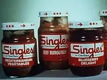 Gerber Singles was a failed product from 1974 by Gerber, a maker of baby food. It was food in glass jars targeted to college students and adults living on their own for the first time.[1] According to Business Insider, Gerber believed that there was a market for single serving, ready to eat foods similar to ready-made baby food. Hoping that college students and other adults would purchase such foods if they were not labeled as "baby food" Gerber developed their "Singles" product. The "fatal flaw" and the reason the product flopped, is that "packages of meat mush didn't exactly scream "cool" to young singles."[2] In January, 2012, an ABC show called Culture Click, called television's first modern-day social studies class, put it on the top ten failed ideas along with New Coke and Bic disposable underwear.