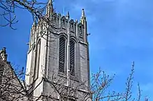 Located abutting Red Square, and constructed entirely of cast stone, Gerberding Hall is built in the collegiate Gothic style with its characteristic elements including gargoyles, pointed arches, towers, and gabled roofs.[1] Along its parapets are 25 sculptures by Dudley Pratt representing different academic disciplines; for example, a figure of the god Neptune on the building's east gable is intended to represent oceanography and fisheries science.[1] The structure is dominated by a central, square tower.[1] On the face of each of its sides is engraved the keys of Phi Beta Kappa.[1] The tower itself, originally intended to serve as a belfry, did not fulfill that purpose until 2008.[1][4] In that year, a set of eight bells – the Gordon Stuart Peek Foundation Memorial Bells – was installed which were designed to be operated by change ringing.[3][4] A shield bearing the visage of Herbert Condon in relief and the words "Friend of Youth" sits over the exterior doorway to the tower.[1][lower-alpha 1]