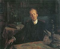 Hauptmann had taken up a lavish lifestyle, lived in expensive hotels, often received guests, and took trips to Italy. He summered in his large house on the Hiddensee, that Günter Kunert called a "do-it-yourself Olympia."[24] Thomas Mann referred to this lavish lifestyle when he called him in 1922 the "King of the Republic."[25] Mann met Hauptmann at an Alpine resort and wrote to his brother, "I hobnob every evening with Hauptmann, who is a really good fellow." In addition Mann adapted some of Hauptmann's traits for his character Mynheer Peeperkorn in his book The Magic Mountain.[26]