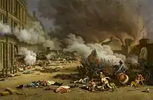 Following the 1791 French legislative election, and after the French Constitution of 1791 was announced in the National Assembly, she resigned from a political career and decided not to stand for re-election. "Fine arts and letters will occupy my leisure."[23] She did, however, play an important role in the succession of Comte de Montmorin the Minister of Foreign Affairs, and in the appointment of Narbonne as minister of War and continued to be centre stage behind the scenes.[24] Marie Antoinette wrote to Hans Axel Fersen: "Count Louis de Narbonne is finally Minister of War, since yesterday; what a glory for Mme de Staël and what a joy for her to have the whole army, all to herself."[25] In 1792 the French Legislative Assembly saw an unprecedented turnover of ministers, six ministers of the interior, seven ministers of foreign affairs, and nine ministers of war.[26] On 10 August 1792 Clermont-Tonnere was thrown out of a window of the Louvre Palace and trampled to death. De Staël offered baron Malouet a plan of escape for the royal family.[27] As there was no government, militant members of the Insurrectionary Commune were given extensive police powers from the provisional, executive council, " to detain, interrogate and incarcerate suspects without anything resembling due process of law".[28] She helped De Narbonne, dismissed for plotting, to hide under the altar in the chapel in the Swedish embassy, and lectured the sans-culottes from the section in the hall.[29][30][31][10]