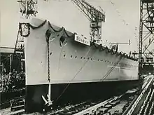 Blücher was ordered by the Kriegsmarine from the Deutsche Werke shipyard in Kiel.[4] Her keel was laid on 15 August 1936,[9] under construction number 246.[4] The ship was launched on 8 June 1937, and was completed slightly over two years later, on 20 September 1939, the day she was commissioned into the German fleet.[10] The commanding admiral of the Marinestation der Ostsee (Baltic Naval Station), Admiral Conrad Albrecht, gave the christening speech. Mrs. Erdmann, widow of Fregattenkapitän (Frigate Captain) Alexander Erdmann, former commander of SMS Blücher who had died in the ship's sinking, performed the christening.[11] As built, the ship had a straight stem, though after her launch this was replaced with a clipper bow increasing the overall length to 205.90 meters (675.5 ft).[3] A raked funnel cap was also installed.[12]
