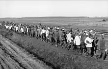 In the summer and autumn of 1941, vast numbers of Soviet prisoners were captured in about a dozen large encirclements. Due to their rapid advance into the Soviet Union and an anticipated quick victory, the Germans did not want to ship these prisoners to Germany. Under the administration of the Wehrmacht, the prisoners were processed, guarded, forced-marched, or transported in open rail cars to locations mostly in the occupied Soviet Union, Germany, and occupied Poland.[18] Much like comparable events, such as the Pacific War's Bataan Death March in 1942, the treatment of prisoners was brutal, without much in the way of supporting logistics.