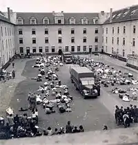 As part of the "Final Solution" from 1942, the persecution of Belgian Jews escalated. From May 1942, Jews were forced to wear yellow Star-of-David badges to mark them out in public.[68] Using the registers compiled by the AJB, the Germans began deporting Jews to concentration camps built by Germans in occupied Poland. Jews chosen from the lists were required to turn up at the newly established Mechelen transit camp; they were then deported by train to concentration camps at Auschwitz and Bergen-Belsen.[68] Between August 1942 and July 1944, around 25,000 Jews and 350 Roma were deported from Belgium; more than 24,000 were killed before their camps were liberated by the Allies.[73] Among them was the celebrated artist Felix Nussbaum.[74]