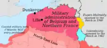 - The Nord-Pas-de-Calais region (with a population of around three million) fell under the jurisdiction of the Lille Oberfeldkommandantur and therefore under the Brussels-based Militärverwaltung.[8] While the entire region remained de jure part of Vichy France, all French laws had to be approved by the Germans before implementation. French government structures were preserved intact. Its border with the rest of France, along the Somme river, was sealed off to all without official approval. The unification of historical French Flanders with Belgium may have been part of an ideological attempt to reunite the historical County of Flanders.[9]