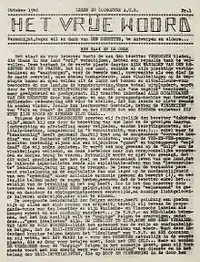 Before the war, several Fascist movements had existed in Flanders. The two major pre-war Flemish Movement parties, the Vlaams Nationaal Verbond (VNV) and Verdinaso, called for the creation of an independent authoritarian Flanders or "Dietse Staat" encompassing both Flanders and the Netherlands.[91][92] Shortly after the occupation, VNV decided to collaborate with the Germans and soon became the biggest group in Flanders, gaining many members after Verdinaso disbanded in 1941 and after fusing with the Flemish wing of the nationwide Fascist Rex Party.[93] There was also an organisation, the Duits-Vlaamse Arbeidsgemeenschap ("German-Flemish Work Community", known by its acronym DeVlag), which advocated Nazi-style anti-clericalism and the inclusion of Flanders into Germany itself.[94]