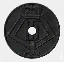 The considerable Belgian gold reserves, on which the Belga had been secured,[lower-alpha 2] were mostly transported to Britain, Canada and the United States before the German invasion. Over 198 tonnes, however, had been entrusted to the Banque de France before the war, and shipped to Dakar in French West Africa.[46] Under the pro-German Vichy régime, the gold was seized by the Germans, who used it to buy munitions from neutral Switzerland and Sweden.[47]