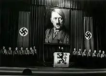Though both Fascist and anti-Semitic, Rex's ideology had been more closely aligned with Benito Mussolini's Partito Nazionale Fascista than with the Nazi Party before the war.[99] Rex's newspaper Le Pays Réel, which frequently attacked perceived Nazi anti-clericalism, had even been banned from circulation in Germany in the 1930s.[100] With the German invasion, however, Rex rapidly accepted the occupation and became a major force in collaboration in Wallonia.[101]
