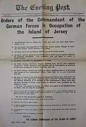 The kommandant issued an order in Guernsey on 2 July 1940 and in Jersey on 8 July 1940 instructing that laws passed by the legislatures would have to be given assent by the kommandant and that German orders were to be registered as legislation. The civil courts would continue in operation, but German military courts would try breaches of German law. At first the bailiffs submitted legislation for the assent of the kommandant signed in their capacities as lieutenant governors. At the end of 1941, the kommandant objected to this style and subsequent legislation was submitted simply signed as bailiff.[1]