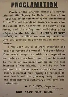 On 17 June 1940, a plane arrived in Jersey from Bordeaux evacuating Brigade General Charles de Gaulle from France.[7] After coffee and refuelling, the plane flew on to Heston, outside London, where next day the general made his historic appeal of 18 June to the French people via the BBC. The last troops left the islands on 20 June, departing so quickly that bedding and half-consumed meals were left in Castle Cornet.[8]