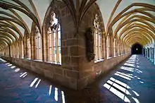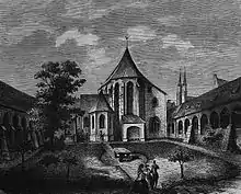 The museum constitutes an architectural monument in itself, as it consists of a variety of buildings erected in different periods. It incorporates the remaining structures of the former Nuremberg Charterhouse (German: Kartäuserkloster), dissolved in 1525 and thereafter used for a variety of secular purposes until in 1857 what was left of these premises, by then badly dilapidated, was given to the Museum. The charterhouse was rebuilt and modified to accommodate the collections until the late nineteenth century when Neo-Gothic extensions were added on its south side. During and after the First World War, the „Alter Eingang“ (Old Entrance) and the „Galeriebau“ (Gallery building) designed by German Bestelmeyer were built to provide an entrance from Kornmarkt and further space.[3]