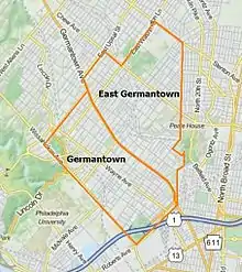 Today, the western part of the former borough is the neighborhood known simply as 'Germantown' (though is sometimes called 'West Germantown') and the eastern part is the neighborhood of 'East Germantown'. While the boundary between the two neighborhoods is not well-defined and has varied over time,[7] these days 'Germantown' usually refers to the part of the former borough that lies west of Germantown Avenue, up through West Johnson Street, and 'East Germantown' to the part that lies east of Germantown Avenue, up through East Upsal Street.[8][9][10]