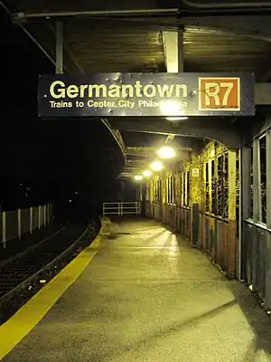 The station is in zone 1 on the Chestnut Hill East Line, on former Reading Railroad tracks, and is 6.8 track miles from Suburban Station. In 2013, this station saw 102 boardings and 140 alightings on an average weekday.[2] On May 28, 2009, SEPTA approved a $1.9 million rehabilitation effort which will include Germantown station.[3]
