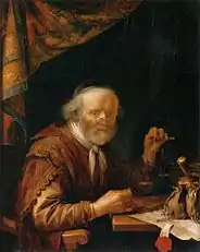 Gerrit Dou (7 April 1613 – 9 February 1675), also known as Gerard Douw or Dow, was a Dutch Golden Age painter, whose small, highly polished paintings are typical of the Leiden fijnschilders. He specialised in genre scenes and is noted for his trompe-l'œil "niche" paintings and candlelit night-scenes with strong chiaroscuro. He was a student of Rembrandt.