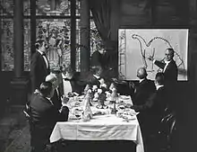The live-action sequence was likely shot on November 19, 1914.[51] It features McCay with several of his friends,[41] such as cartoonists George McManus and Tad Dorgan, writer Roy McCardell, and actor Tom Powers;[52] McCay's son Robert had a cameo as a camera-room assistant.[41] McCay used a bet as a plot device, as he had previously in the Little Nemo film.[53]
