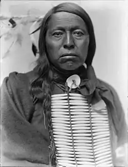 Käsebier's session with Iron Tail was her only recorded story: “Preparing for their visit to Käsebier’s photography studio, the Sioux at Buffalo Bill's Wild West Camp met to distribute their finest clothing and accessories to those chosen to be photographed.”[8] Käsebier admired their efforts, but desired to, in her own words, photograph a “real raw Indian, the kind I used to see when I was a child’, referring to her early years in Colorado and on the Great Plains. Käsebier selected one Indian, Iron Tail, to approach for a photograph without regalia. "He did not object. The resulting photograph was exactly what Käsebier had envisioned: a relaxed, intimate, quiet, and beautiful portrait of the man, devoid of decoration and finery, presenting himself to her and the camera without barriers." Several days later, Chief Iron Tail was given the photograph and he immediately tore it up, stating that it was too dark.[9] Käsebier rephotographed him, this time in his full regalia. Iron Tail was an international celebrity. He appeared with his fine regalia as the lead with Buffalo Bill at the Avenue des Champs-Élysées in Paris, France, and the Colosseum of Rome. Iron Tail was a superb showman and chaffed at the photo of him relaxed, but Käsebier chose it as the frontispiece for a 1901 Everybody’s Magazine article. Käsebier believed all the portraits were a "revelation of Indian character," showing the strength and individual character of the Native Americans in "new phases for the Sioux."[10]