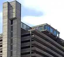 Locations along the east coast of England had been scouted by Hodges and Klinger in the spring of 1970, to find a landscape that suggested a "hard, deprived background".[7] Newcastle was selected after Hodge's first choice of Hull proved to be unsuitable.[7][38] Hodges thoroughly researched the local Newcastle crime scene, adapting the script to make use of settings and incorporating elements of his research into the story.[36] His background at World in Action had made him accustomed to making films based on hard investigation and this informed his approach to Get Carter.[2][35] One of the first locations which attracted Hodge's attention was the Trinity Square multi-storey car park, which dominated the centre of Gateshead. To Hodges, the car park and the cast iron bridges over the Tyne, "seemed to capture the nature of Jack Carter himself".[39] The car park symbolises one of the film's more subtle themes, which is the destruction of an old cityscape and its rebuilding in line with modern Brutalism.[42] Hodges described how wandering alone through the upper structure, he realised how the different levels could be used to reveal the hunter, Carter, and the hunted, Brumby, simultaneously but without either being aware of the other – adding to the suspense.[39] The shopping centre and car park were closed in early 2008, and demolished in late 2010.[43]