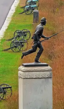 The Gettysburg National Military Park protects and interprets the landscape of the 1863 Battle of Gettysburg during the American Civil War. Located in Gettysburg, Pennsylvania, the park is managed by the National Park Service.[4] The GNMP properties include most of the Gettysburg Battlefield, many of the battle's support areas during the battle (e.g., reserve, supply, and hospital locations), and several other non-battle areas associated with the battle's "aftermath and commemoration", including the Gettysburg National Cemetery.[5] Many of the park's 43,000 American Civil War artifacts are displayed in the Gettysburg Museum and Visitor Center.[6]