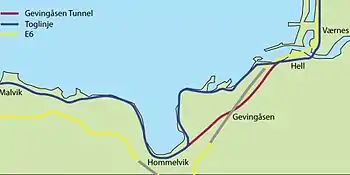 The tunnel was built between Hommelvik and Hell on the Nordland Line, through the hill Gevingåsen.[1] The tunnel is 4.4 kilometers (2.7 mi) long, although the whole project consists of 5.7 kilometres (3.5 mi) of track.[2] The tunnel carries a single track, reducing travel time by five minutes. It has also created the same distance between all passing loops between Trondheim and Stjørdal, allowing the capacity to increase from 5.4 to 8 trains per hour (both directions combined). The old right-of-way, located on a ledge over the sea and prone to landslides, is to be closed. In addition, 92 houses are projected to enjoy reduced noise pollution after the closing. Gevingsåsen was the first part of the plan to reduce rail travel time from Trondheim to Steinkjer to one hour.[1] Politicians have suggested that after the tunnel is completed, they want to electrify the tracks from Trondheim to Steinkjer.[3] The E6 motorway runs in a similar direction through Gevingåsen in the Hell Tunnel.[1]