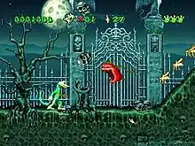 Many of Gex's default abilities take advantage of his special characteristics as a gecko.[1] In addition to being able to walk, run, and jump, he can attach himself to walls and ceilings and crawl along them using the suction pads on his feet, allowing him to reach higher areas.[6] Gex primarily attacks with his tail; he can whip it in a full circle to defeat enemies, activate switches, and deflect projectiles.[7] He can coil it into the shape of a spring to bounce off enemies and other objects.[8] Levels contain assorted collectible power-ups which can provide Gex with several different abilities, such as enhanced speed, invulnerability, and one of many different types of projectiles that can be launched from his mouth. Gex can obtain and utilize these power-ups by lashing his gecko tongue out and consuming them; alternatively, these items can be tail whipped in order to replenish lost health at the expense of the item's primary effect.[9] Gex's health is represented by three "hit paws", and he loses one whenever he is hit by an enemy or a hazard. If the player loses all of their hit paws, then they lose a life. The number of hit paws can be extended to six by finding a certain power-up.[10] The player begins the game with three lives, though more can be earned by collecting a hundred Golden flies in a level. Losing all lives causes the game to be over, forcing players to restart from the beginning (or from they last saved in the 3DO release).[10]