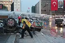 Riot police forces enter Taksim square early in the morning. They make announcements that they will not be entering Gezi Park and their mission is to open Taksim Square to traffic again. Most protesters gather at Gezi Park, but a small group carrying banners of the Socialist Democracy Party retaliate using molotov cocktails and slingshots.[168] Some people like Luke Harding from The Guardian claims that undercover police threw molotov cocktails, "staging a not very plausible 'attack' on their own for the benefit of the cameras."[169][170] These claims were rejected by the governor of Istanbul, Hüseyin Avni Mutlu.[171]