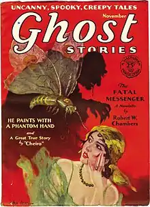Fantasy and occult fiction had often appeared in popular magazines prior to the twentieth century, but the first magazine to specialize in the genre, Weird Tales, did not appear until 1923.[1] Ghost Stories, which was launched by Bernarr Macfadden in July 1926, is one of Weird Tales' earliest competitors.[1] Macfadden also published true confession magazines such as True Story; Ghost Stories followed this format, with the contents mostly produced by the publisher's staff writers, and attributed in print to a first-person narrator. The magazine was initially printed on slick paper, which was sufficiently good quality to allow photographs to be used, and many of the stories had accompanying photographs purporting to be of their protagonists. These were replaced by line drawings when the magazine was switched to pulp paper in July 1928. Ghost Stories occasionally printed contributions from outside writers, including "The Apparition in the Prize Ring", by Robert E. Howard, under the pseudonym "John Taverel". Popular writers such as Frank Belknap Long, Hugh B. Cave, Victor Rousseau, Stuart Palmer, and Robert W. Sneddon all sold stories to Ghost Stories, though the quality suffered because of the limited scope the magazine's formula gave them. Carl Jacobi's first published story, "The Haunted Ring", appeared in the final issue.[2][3][note 1]