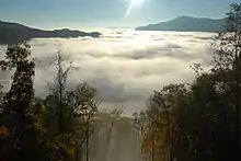 The park is located on a ridge extending from Buck Mountain border, an extension of the Cataloochee Divide, to the Great Smoky Mountains National Park. The park's entrance is located on U.S. Highway 19, the main road through the town of Maggie Valley. An unusual aspect of this park is that it is located atop a mountain which originally could only be accessed by visitors via a 3,370-foot-long (1,030 m) chair lift or an inclined funicular railway. Attempts to move visitors to the park by bus proved problematic.[1](At one time visiting the closed park was possible via an abandoned road, but it is a private property and as of October 2019 the new owners have increased security and limited access.) These methods of transport to the park started at the parking area beside Jonathan Creek at an elevation of 3,150 feet (960 m), climbing to the lower level of the park at 4,400 feet (1,300 m), a climb of 1,250 feet (380 m). The recreated "Ghost Town" sits at 4,600 feet (1,400 m), with the highest elevation in the park being about 4,650 feet (1,420 m).