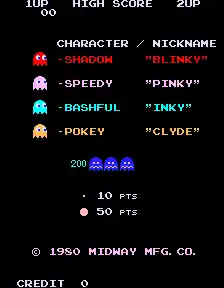 ![]() Pac-Man title screen featuring the ghosts and their names. Below is their appearance when they are edible. | |