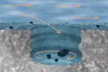 Giant's kettles are formed while a bedrock surface is covered by a glacier. Water, produced by the thawing of the ice and snow, forms streams on the surface of the glacier, which, having gathered into their courses a certain amount of morainic debris, finally flow down a crevasse as a swirling cascade or moulin. The sides of the crevasse are abraded, and a vertical shaft is formed in the ice.[2] The erosion may be continued into the bed of the glacier; and, the ice having left the district, the giant's kettle so formed is seen as an empty shaft, or as a pipe filled with gravel, sand, or boulders. Such cavities and pipes afford valuable evidence as to the former extent of glaciers.
