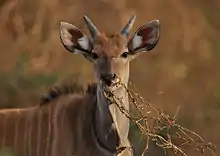 Primarily a herbivore, the giant eland eats grasses and foliage, as well as other parts of a plant.[17][25] In the rainy season, they browse in herds and feed on grasses. They can eat coarse, dry grass and weeds if nothing else is available. They eat fruits too, such as plums. A study in South Africa showed that an eland's diet consists of 75% shrubs and 25% grasses, with highly varying proportions. They often use their long horns to break off branches.[31]