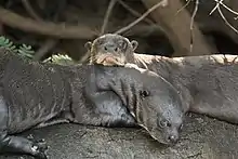 Details of giant otter reproduction and life cycle are scarce, and captive animals have provided much of the information. Females appear to give birth year round, although in the wild, births may peak during the dry season. The estrous cycle is 21 days, with females receptive to sexual advances between three and 10 days.[47] Study of captive specimens has found only males initiate copulation.[4] At Tierpark Hagenbeck in Germany, long-term pair bonding and individualized mate selection were seen, with copulation most frequently taking place in water.[48] Females have a gestation period of 65 to 70 days, giving birth to one to five pups, with an average of two.[47][48] Research over five years on a breeding pair at the Cali Zoo in Colombia found the average interval between litters was six to seven months, but as short as 77 days when the previous litter did not survive.[4] Other sources have found greater intervals, with as long as 21 to 33 months suggested for otters in the wild.[47]