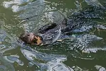 The species can hunt singly, in pairs, and in groups, relying on sharp eyesight to locate prey.[57] In some cases, supposed cooperative hunting may be incidental, a result of group members fishing individually in close proximity; truly coordinated hunting may only occur where the prey cannot be taken by a single giant otter, such as with small anacondas and juvenile black caiman.[44] The giant otter seems to prefer prey fish that are generally immobile on river bottoms in clear water. Prey chase is rapid and tumultuous, with lunges and twists through the shallows and few missed targets. The otter can attack from both above and below, swiveling at the last instant to clamp the prey in its jaws. Giant otters catch their own food and consume it immediately; they grasp the fish firmly between the forepaws and begin eating noisily at the head.[57] Carter and Rosas have found captive adult animals consume around 10% of their body weight daily—about 3 kilograms (7 lb), in keeping with findings in the wild.[58]