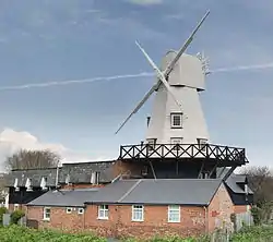 A mill has stood on this site since 1596, and a post mill is known to have been built here in 1758.[2] Gibbet Mill was built in 1824, the name Barry's mill coming from an early miller.[3] The mill was working by wind until 1912, and was used as a bakery until 13 June 1930 when it was burnt down.[2] The new mill was erected in 1932, Neve's of Heathfield being responsible for the millwrighting work.[3]