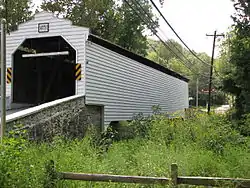 Gibson's Covered Bridge, also known as Harmony Hill Bridge, is a historic wooden covered bridge located in East Bradford Township and West Bradford Township, Chester County, Pennsylvania. It is a 78-foot-long (24 m) Burr truss bridge, constructed in 1872. It has stepped portals and horizontal clapboard siding. It crosses the East Branch Brandywine Creek.[2]