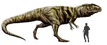Giganotosaurus (/ˌdʒaɪɡəˌnoʊtəˈsɔːrəs/ JY-gə-NOH-tə-SOR-əs[2]) is a genus of theropod dinosaur that lived in what is now Argentina, during the early Cenomanian age of the Late Cretaceous period, approximately 98 to 97 million years ago. The holotype specimen was discovered in the Candeleros Formation of Patagonia in 1993, and is almost 70% complete. The animal was named Giganotosaurus carolinii in 1995; the genus name translates as "giant southern lizard" and the specific name honors the discoverer, Rubén D. Carolini. A dentary bone, a tooth and some tracks, discovered before the holotype, were later assigned to this animal. The genus attracted much interest and became part of a scientific debate about the maximum sizes of theropod dinosaurs.