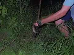 Although capturing frogs with a net or clasp pole may be referred to as frog gigging by some, this is incorrect, as a gig is not being used. Handling frogs with the objective of releasing them may harm the creature because some chemicals present on human skin can easily be absorbed by the frog's skin.