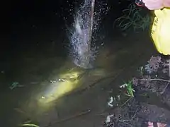 Suckers are a bottom-feeding fish common throughout many parts of the US. The gigging of suckers for food occurs predominately in southern Missouri and northern Arkansas, in the region referred to as the Ozarks. Sucker gigging is usually done at night with lights to maximize the visibility of the fast moving fish. Ozarks residents of the past often waded the clear local streams at night and gigged suckers while using light from hand-held lanterns.[2] Modern sucker gigging uses specially constructed jon boats that have a set of lights mounted on the bow of the boat and a railing around the bow that allows the "gigger" to stand up and peer out in front of the boat in an attempt to locate and gig fish.[3] The lighting system is often powered by gas, a generator, or a battery.