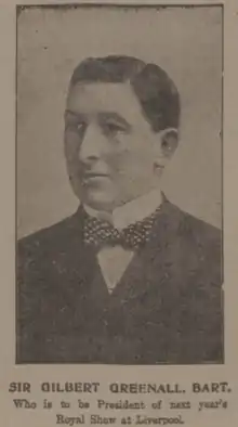 Greenall was the son of Sir Gilbert Greenall, 1st Baronet. The family's wealth was based on the brewing business established by Greenall's great-grandfather Thomas Greenall in 1762 (which later became the Greenall's Group PLC). His father also had large interests in canals and banking. Greenall succeeded his father in the baronetcy in 1894 and notably served as High Sheriff of Cheshire in 1907, being appointed a deputy lieutenant the same year.[1] In 1927 he was raised to the peerage as Baron Daresbury, of Walton in the County of Chester.