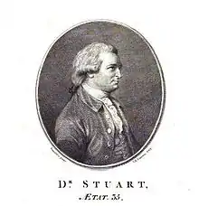 Stuart was a critic of the historian William Robertson, who was the leader of the Moderates in the Church of Scotland. In his view, instead of supporting Catholic toleration, Robertson should have been more assertive in defending the interests of the Kirk. In 1778 Stuart was an unsuccessful candidate for the professorship of public law at the University of Edinburgh, and he believed that Robertson was responsible for his failure.[2] Stuart nursed his resentment of Robertson over this supposed intervention.[1] In 1785 William Robertson, eldest son of the historian, fought a duel with Stuart, which both survived.[3]