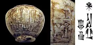 Most historians generally agree Gilgamesh was a historical king of the Sumerian city-state of Uruk,[13][14][15][16] who probably ruled sometime during the early part of the Early Dynastic Period (c. 2900 – 2350 BC).[13][14] Stephanie Dalley, a scholar of the ancient Near East, states that "precise dates cannot be given for the lifetime of Gilgamesh, but they are generally agreed to lie between 2800 and 2500 BC".[14] An inscription possibly belonging to a contemporary official under Gilgamesh was discovered in the archaic texts at Ur;[17] his name reads: "Gilgameš is the one whom Utu has selected". Aside from this the Tummal Inscription, a thirty-four-line historiographic text written during the reign of Ishbi-Erra (c. 1953 – c. 1920 BC), also mentions him.[15] The inscription credits Gilgamesh with building the walls of Uruk.[18] Lines eleven through fifteen of the inscription read: