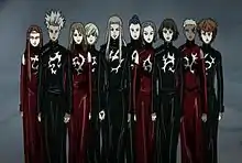 Gilgamesh are six men and four women, capable of using Dynamis, who work for the scientist/terrorist Enkidu. Often portrayed as the antagonists and enemies of Orga, they are the 10 test subjects that Enkidu fled Heaven's Gate with. Their goal is to serve Enkidu by destroying the tower created to restore the blue sky and later cleanse the world in order to perpetuate a new species of human. Gilgamesh are created as half human, half god and made of anti-matter. They are referred to as 'God Beasts', referring to their second, non human forms. Gilgamesh are named after the lot number they were in the tomb of Gilgamesh. The female members of Gilgamesh wear red and the male members wear black and their tattoos, each in different places on their bodies, signify different aspects of divinity. The Gilgamesh never reveal their names in the anime.